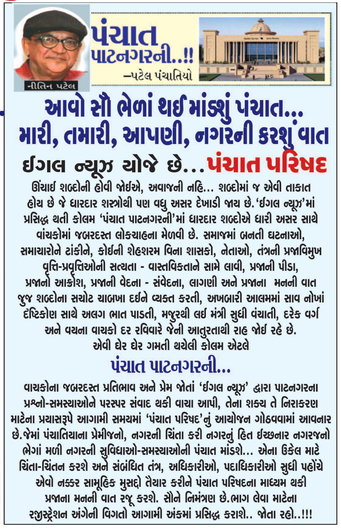 આવો સૌ ભેળાં થઈ માંડશું પંચાત..મારી,તમારી,આપણી,નગરની કરશું વાત