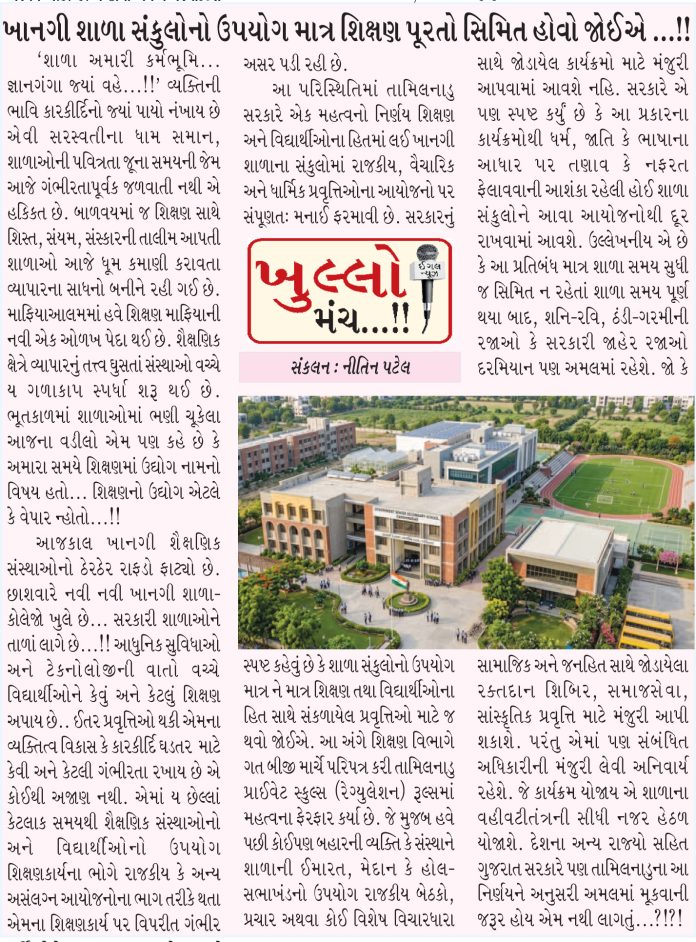 ખાનગી શાળા સંકૂલોનો ઉપયોગ માત્ર શિક્ષણ પૂરતો સિમિત હોવો જોઈએ..!!
