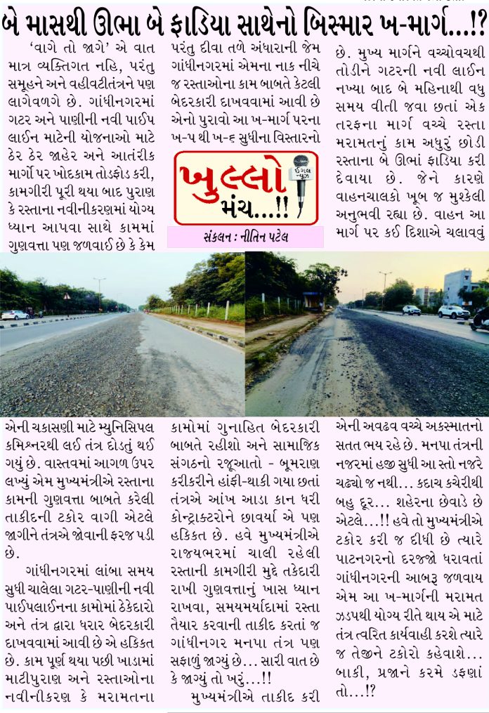 બે માસથી ઉભા બે ફાડિયા સાથેનો બિસમાર ખ- માર્ગ  …!!?