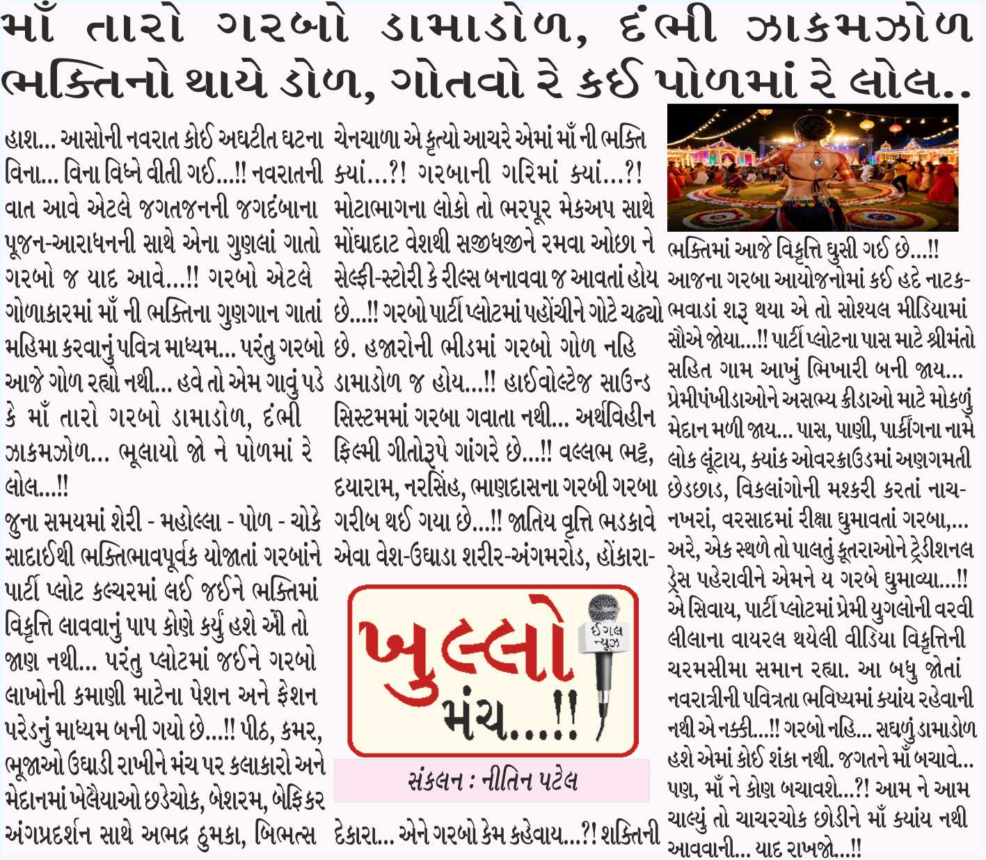 માં તારો ગરબો ડામાડોળ,દંભી ઝાકમઝોળ..ભક્તિનો થાયે ડોળ,ગોતવો રે કઈ પોળમાં રે લોલ..