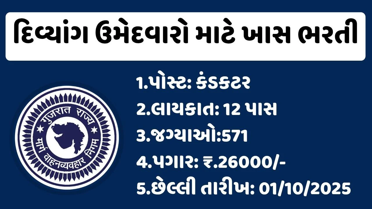 ગુજરાત એસટીમાં નોકરી મેળવવાની રાહ જોઈ રહેલા ઉમેદવારો માટે સારા સમાચાર આવી ગયા છે. ગુજરાત રાજ્ય માર્ગ વાહન વ્યવહાર નિગમ દ્વારા દિવ્યાંગ અનામતની જગ્યાઓ ભરવા માટે ખાસ ભરતીનું નોટિફિકેશન બહાર પાડ્યું છે. કંડક્ટર કક્ષાની કૂલ 571 જગ્યાઓ ભરવા માટે GSRTC એ ઉમેદવારો પાસે ઓનલાઈન અરજીઓ મંગાવી છે.ગુજરાત રાજ્ય માર્ગ વાહન વ્યવહાર નિગમ કંડક્ટર કક્ષાના દિવ્યાંગ અનામતની જગ્યાઓની ઘટ ખાસ ભરતી ઝુંબેશથી સીધી ભરતી (ફીક્સ પગાર) અન્વયે પસંદગીયાદી-પ્રતીક્ષાયાદી તૈયાર કરવા માટે ફક્ત દિવ્યાંગ ઉમેદવારો પાસેથી ઓનલાઈન અરજી પત્રકો મંગાવવામાં આવે છે. આ માટે ઉમેદવારો https://ojas.gujarat.gov.in વેબસાઈટ ઉપર અરજી કરી શકશે.